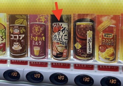 自動販売機にて、一際異端なオーラを出している【カニ鍋スープ 雑炊仕立て(お米入り)】というものを発見いたしました。